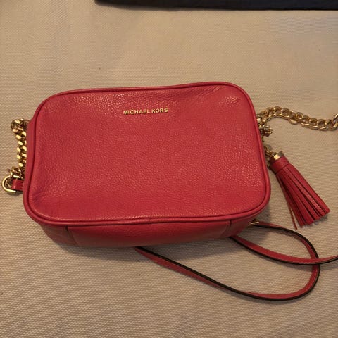 Michael Kors jet set læder taske til kvinde i bordeaux farve. Tasken har en lynlås, en justerbar skulderrem med kædedetaljer og flere indvendige lommer til opbevaring. Materialet er læder med en foret inderside.