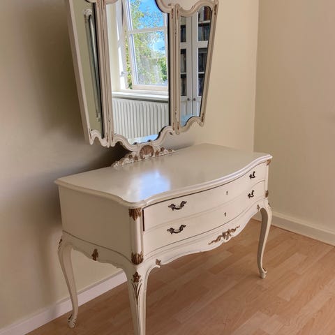 Skufferne har håndskårne sinkesamlinger, som vidner om gedigent håndværk, og alle skuffer fungerer, som de skal. Spejlet er intakt, og møblet er stabilt og klar til brug.