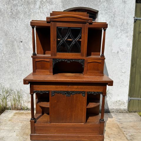 Smukt og praktisk gammelt skab / dækketøjsskab med 2 låger og 3 hylder + 1 skuffe i hver side jvf. fotos.