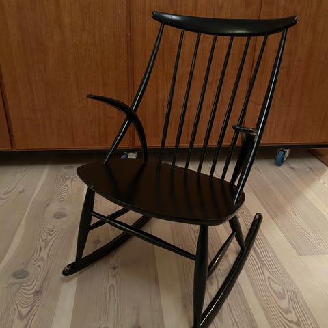 Sælger denne gamle Illum wikkelsø gyngestol, jeg har fjernet gammel maling, så den er klar til ny, eller den kan også stå med det rå look.