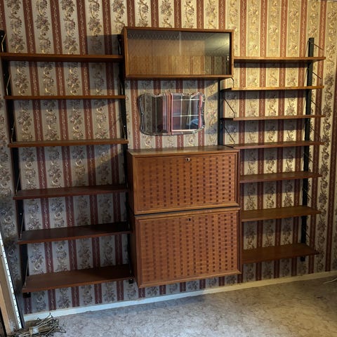 Systemet er opbygget med vægmonterede metalskinner, løse hylder og specialmoduler – præcis den fleksibilitet der gjorde disse systemer ikoniske i både danske hjem og arkitekttegnede boliger.