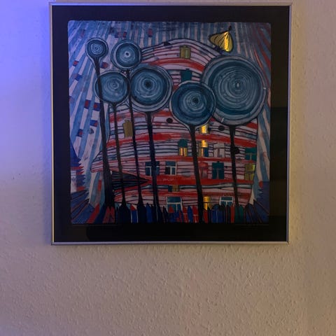 Hundertwassers poetiske billedunivers, der blandede figuration og abstraktion, er også inspireret af Paul Klee. Mennesker i storbyen, huse, vinduer og gadeforløb skildres i overensstemmelse med hans visioner om et tættere forhold mellem kunstnerisk skaben, natur og samfund.