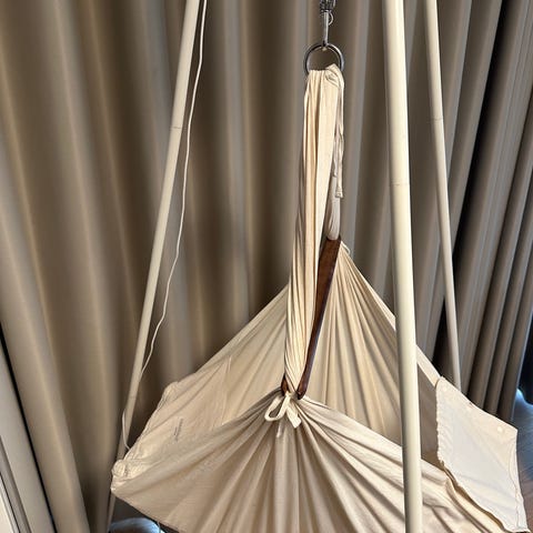 Moonboon slyngevugge i beige bomuld med motor, stativ og karmbeslag