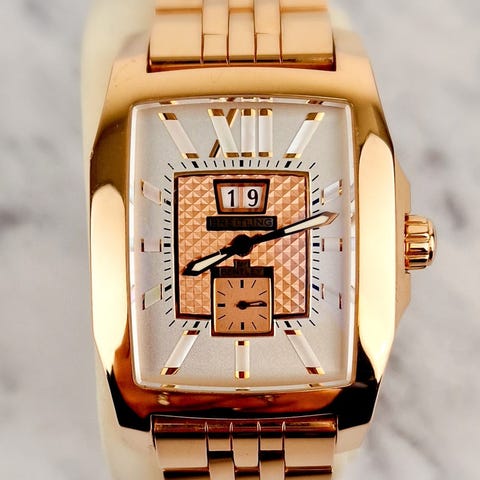 While often classed as 18K rose gold, I feel it is so close to yellow gold that it could be called either. Breitling uses a wide spectrum of hues from its different rose gold models. The face of the watch is beautiful and has many useful features. There are luminescent Arabic hour numbers and rose gold numbers and markers across the main dial and sub-dials that have a brilliant sheen. The moonphase complication gives the watch an added layer of functionality that sets it apart from many other luxury watches. The knurled bezel is a distinct feature associated with the prestige aircraft and automobile heritage of the brand. Indeed, the watch was owned by the head of the Bentley and Rolls Royce owners group before being made available for sale to the public here.