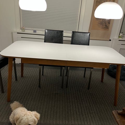 Sortlakerede stålben, gråblå laminatbordplade med sorte kanter.