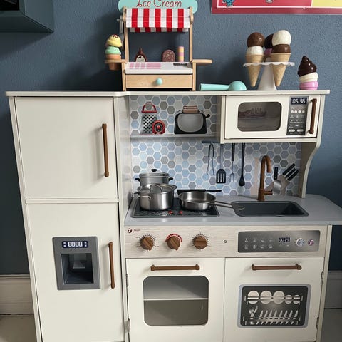 Jollyroom legekøkken i hvid farve. Køkkenet har flere hylder, ovn, komfur med knapper og vask med hane. Masser af tilbehør medfører