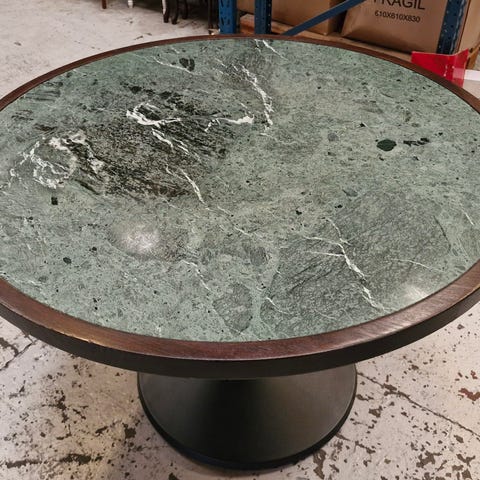 Skrivebord med marmorplade og træramme. Bordet har en lys træfinish og en hvid marmoroverflade. Designet med skuffer og skabe til opbevaring. Velegnet til kontor eller arbejdsrum.