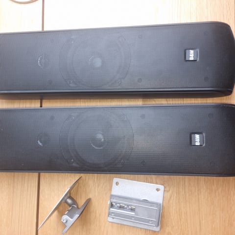 Bowers & Wilkins højtalersæt bestående af to store og tre mindre enheder. Farven er hvid med sorte elementer. Sættet inkluderer tilhørende kabler og beslag til montering. Velegnet til lydsystemer med flere kanaler.