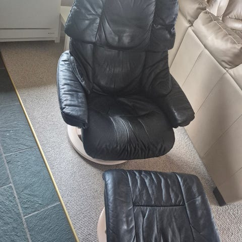 Meget lækker Stressless mørkebrun læder lænestol. Modellen er Reno med power og batteri.