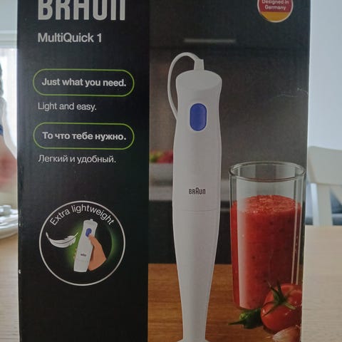 Braun Multiquick 5 stavblender sæt med flere tilbehørsdele til forskellige madlavningsopgaver. Indeholder blenderstav, piskeris og hakker. Designet til nem og effektiv madlavning.
