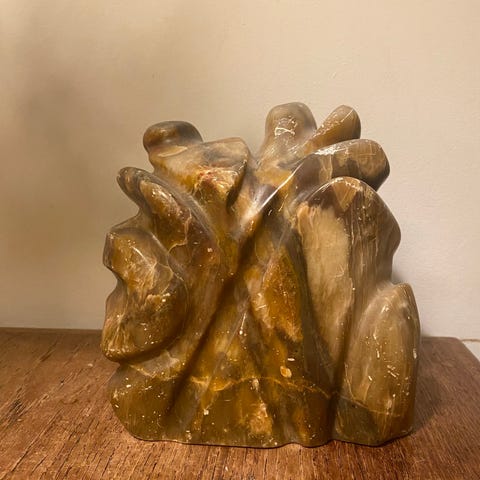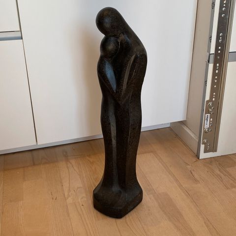 Abstrakt skulptur fremstillet i sten med en højde på cirka 22 cm. Skulpturen har en organisk form med åbninger og afrundede kanter, og den står på en stenbase. Farven er en blanding af mørke og lyse nuancer i stenens naturlige mønster. Har lidt patina.