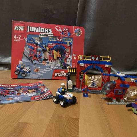 LEGO Juniors Spider-Man legetøjssæt med figurer og køretøjer. Indeholder en helikopter, en scene med spindelvæv og flere LEGO-figurer. Passer til børn og samlere, der er interesserede i Spider-Man temaet.