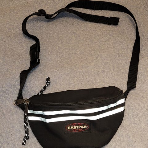 Brugt få gange. Eastpak bæltetaske i stof med camouflageprint. Tasken har justerbar rem, et hovedrum fortil og et mindre bagtil. Måler 22X15 cm.