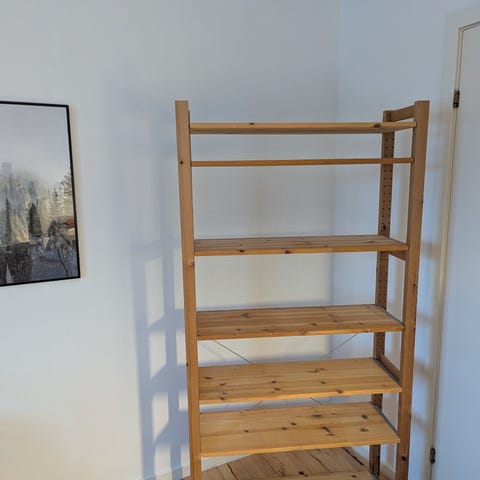 IKEA Sven Ivar Dysthe reol i lyst træ. Reolen har flere hylder og er designet til opbevaring og organisering af forskellige genstande. Materialet er lyst træ, hvilket giver et naturligt udseende. Reolen er velegnet til forskellige rum og formål.