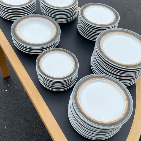 6 suppetallerkener. En sovsekande. To serveringsskåle med et låg. Alt i fin stand uden brugsmærker