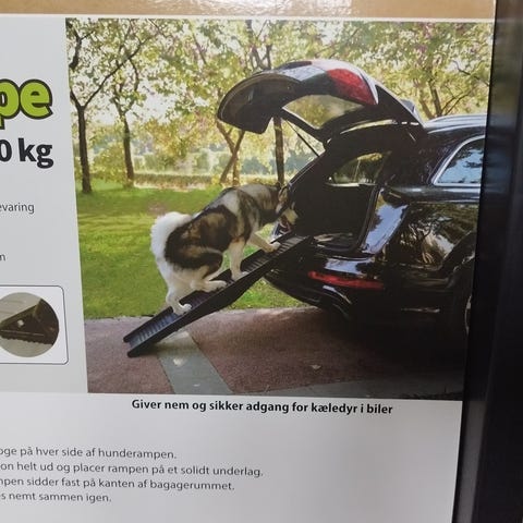 Foldbar rampe som sikrer at hunden kommer sikkert ind og ud af bilen.