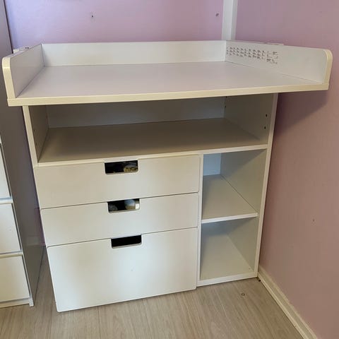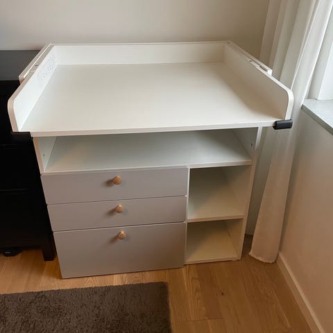 IKEA SMÅSTAD Puslebordet kan laves om til et skrivebord til børn. Med tre skuffer. Mål: 90 cm i bredde, 79 cm i dybde og 100 cm i højde. Pulsebordet/skrivebordet har et åbent rum og hylder til opbevaring. Materialet er hvidt laminat. Velegnet til børneværelse.
