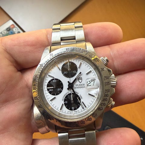Klassisk Tudor Prince Oysterdate i stål og guld med smuk champagnefarvet skive, dato med cyklop, riflet guld lynette og den ikoniske Jubilee-lænke i stål/guld med synligt stræk, i tråd med alder og brug. Inde i urkassen sidder det automatisk selvoptrækkende ETA 2824-2 værk som yder 38 timers gangreserve.