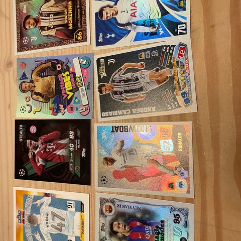Topps UEFA Champions League Man of the Match samlekort med autografer og spillerstatistikker. Kortene viser forskellige professionelle fodboldspillere fra klubber som Arsenal, AC Milan, Juventus, Bayern München og Borussia Dortmund. Hvert kort indeholder spillerens navn, klub, position, og vurderinger i angreb og forsvar.