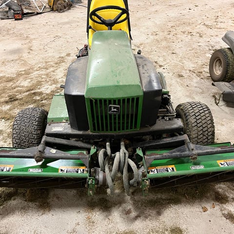 John Deere plænetraktor med grøn karrosseri og gul sæde. Udstyret med ratstyring og klippeaggregat under køretøjet. Egnet til græsslåning på større arealer.- der er påsat anhænger knop så man kan køre med trailer eller rive evt