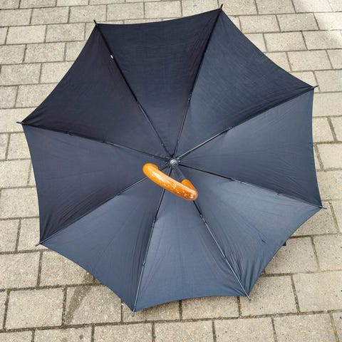 paraply i multifarvet sort hvid . Paraplyen har et mønstret design og er sammenklappelig med metalstel. Velegnet til brug som beskyttelse mod regn.
