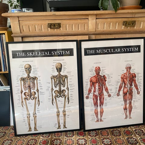 Anatomisk plakat med illustration af et kranium set forfra, inkl ramme 77x56.5 cm.