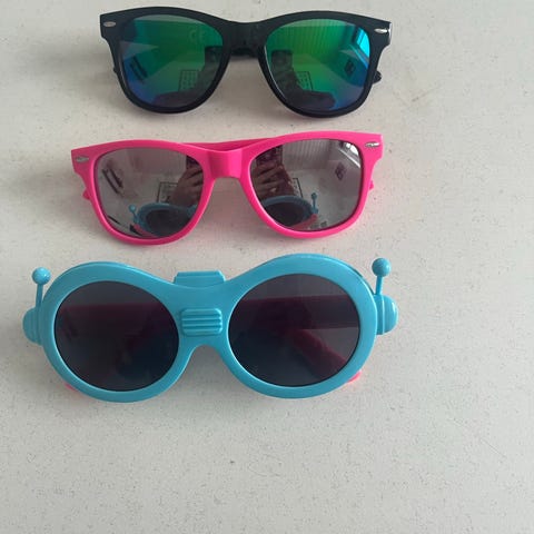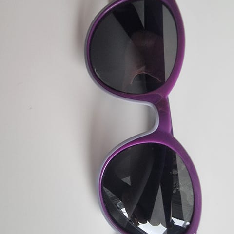 solbriller i lilla farve. Brillerne har en oval form og er designet til børn.