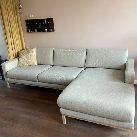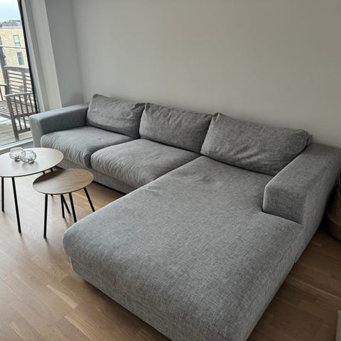 Nyligt renset Scandinavia Remix 3 personers sofa fra Bolia med chaiselong til venstre (set forfra) i grå. Ben af hvidolieret eg. Købt i 2020 og er i fin stand.