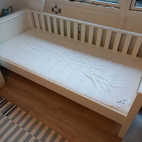 Jysk enkeltseng i hvid farve. Sengen har en enkel og funktionel konstruktion med lamelbund. Passer til madrasstørrelse 140x200 cm. Købt i 2024, sælges med madrassen. Næsten ny og ren