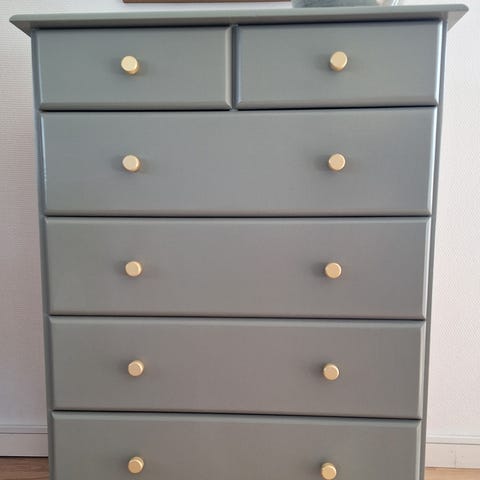 Smuk og stilfuld kommode i klassisk design med bløde, buede fronter og elegante messingfarvede greb. Meget velholdt