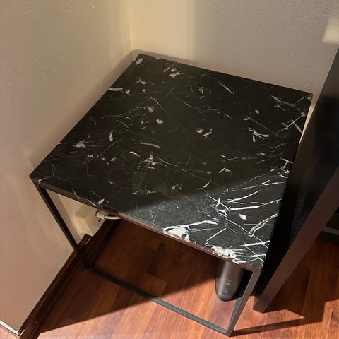 Bordpladsen er melamin med marmorlook, og stellet er metal. Mål: 80 cm. i diameter og 45 cm. i højden.