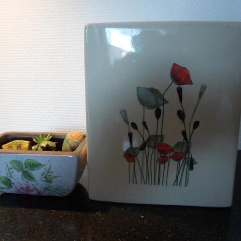 Keramik urtepotte med dekorativt mønster i brunlige nuancer. Potten har en rund form og kan bruges til planter og blomster i hjemmet eller haven. Du kan sende sms paa tlf. 23262548.