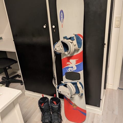 Rossignol snowboard med tilhørende bindinger. Snowboardet har et farverigt design med blå, lilla og hvide elementer . Burton Bindingerne er hvide med justerbare stropper. Str M