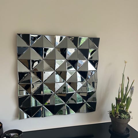 Super flot vægspejl og som dekoration til væggen . Stjernespejl . Et hjørne har en knækket kant men sidder stadig fast .
