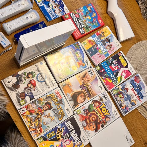 Nintendo Wii konsol med tilbehør, inklusive Wii Balance Board, Wii Remote controllere, Nunchuks, pistol til remotes, alle kabler og 15 spil.