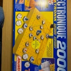 Bloc-Tronic Electronic Construction Toy med elektroniske komponenter til samling og eksperimenter. Indeholder forskellige dele til at bygge og teste elektroniske kredsløb. Leveres i opbevaringskasse med instruktioner.