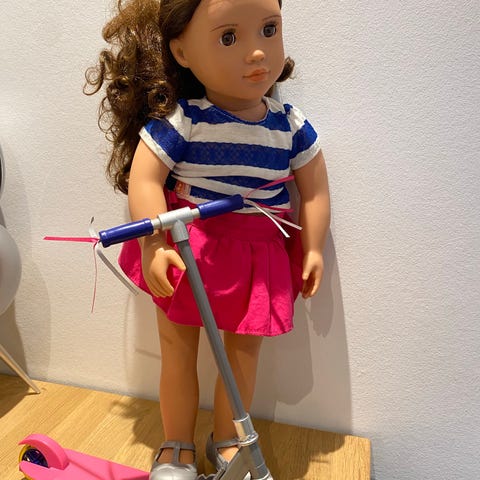Baby Born dukke med tilbehør bestående af en klapvogn, gynge og forskellige beklædningsdele. Dukken er klædt i lyserødt tøj med matchende hue og savlesmæk. Inkluderer også en sovepose og ekstra tøjstykker i forskellige farver. Passer til leg og rolleleg for børn.
