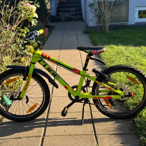 Cube børnecykel med 20" hjul, blå farve. Cyklen er designet til børn og har funktioner tilpasset børns behov.