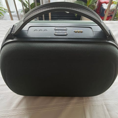 Længde 40 cm, bredde 23 cm, højde 20 cm. Indvendig blå elastikker og lomme af stof.