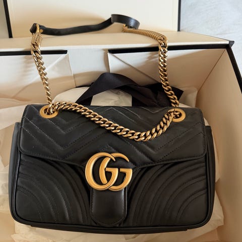 Gucci GG Marmont Small skuldertaske til kvinde i lyserød farve. Tasken er lavet af andre materialer og har en kæderem. Velegnet til daglig brug og tilføjer et stilfuldt element til forskellige outfits. Denne taske i denne farve er der kun lavet 500 i verden. Er købt i Kastrup lufthavn. Så der er ægtheden . Havde ønsket mig en, men viser den ikke er mig.