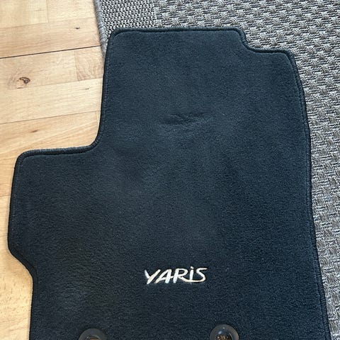 Toyota Yaris bilgulvmåtter i gummimateriale. Sættet indeholder fire måtter med forskellige størrelser og former tilpasset bilens gulv. Måtterne er mørke gråog designet til at beskytte bilens gulv mod snavs og slid. Se fotos. Sommer stof måtter kan tilkøbes for 600 kr.