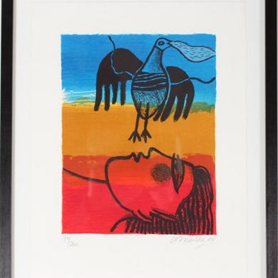 To kompositioner, 1996. Signeret Corneille 96, 186/200. Bladstørrelse 42 x 60 cm. Indrammet i træramme med målene 52 x 59,3 cm. Pr stk 2100,- Begge 4000,-.