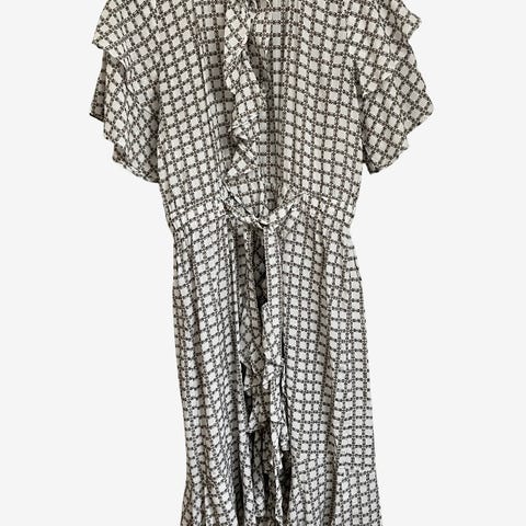 Kjolen har lange ærmer og en stribet mønstring i blå, sort og beige nuancer. Med folder/rynker for og bag. Har lynlås i nakken,Bemærk at mail, chat og beskeder ikke besvares, og varen skal købes på knappen "Gå til varen"