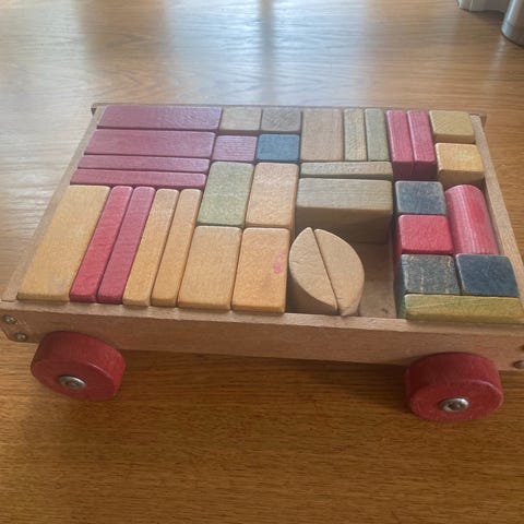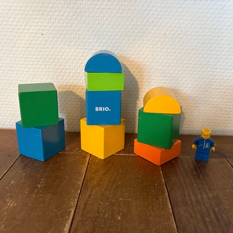 Der er stabile klodser og kugler i forskellige geometriske former. Træmateriale.,Afhentes i:,Røde Kors Holstebro (661),Bemærk at mail, chat og beskeder ikke besvares, og varen skal købes på knappen "Gå til varen"