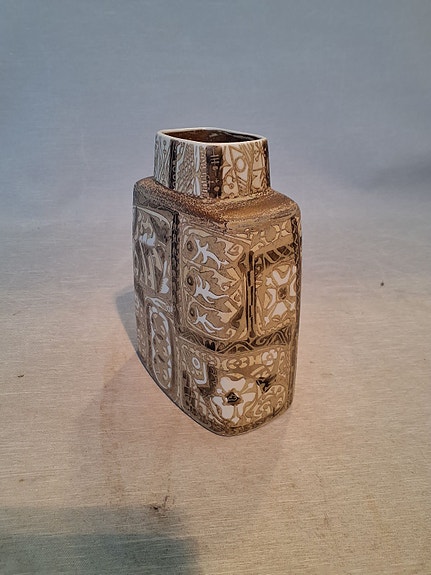 Lampens krop er lavet af hvid keramik med blåt mønster. Den har en cylindrisk form.