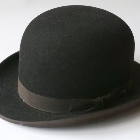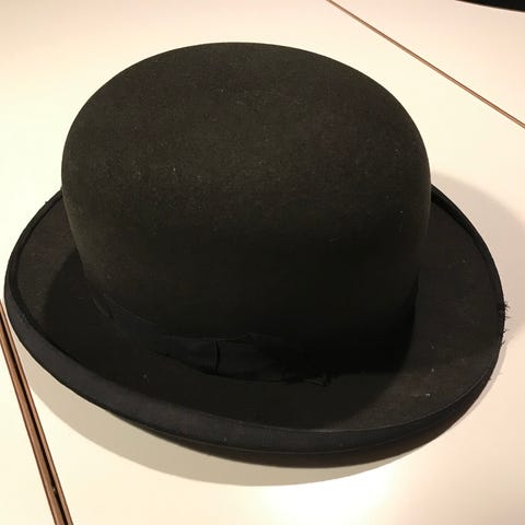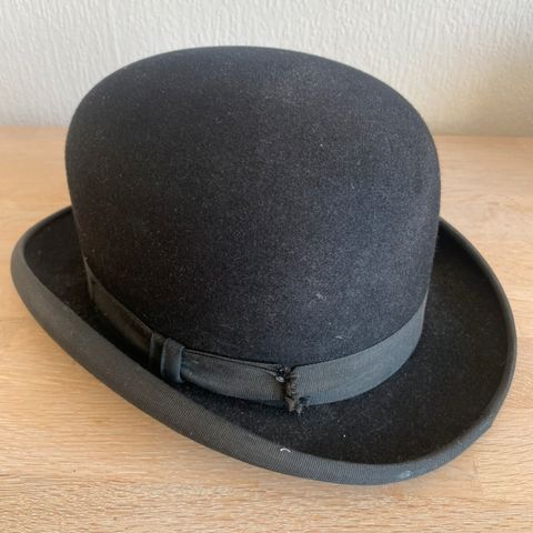 Hatten har en rund form med en bred skygge. Den er lavet af filtet uld med et satinbånd.