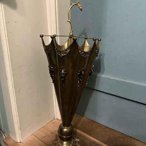 Egetræ Art Deco chopstick-holder fra Storbritannien i fremragende stand, 69 cm bred, 70 cm høj, 25 cm dyb, brun, fra begyndelsen af det 20. århundrede, med tre rum, aftagelig drypbakke, rulleben og svampeformede endestykker. Klik på den blå "gå til varen" knap, for at købe eller byde på denne vare. Den samlede pris vil blive vist inden du afgiver dit bud.