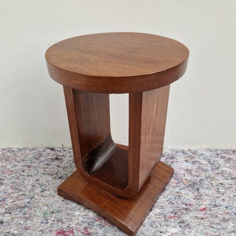 Art Deco lille sidebord i træ med marquetering i valnøddeloupe, oprindelse Frankrig, octagonalt format, målene er 60 cm i højden, 50 cm i bredden og 38 cm i dybden, omkring 1970–1980, i god stand med få brugsspor og aldersrelaterede pletter. Klik på den blå "gå til varen" knap, for at købe eller byde på denne vare. Den samlede pris vil blive vist inden du afgiver dit bud.