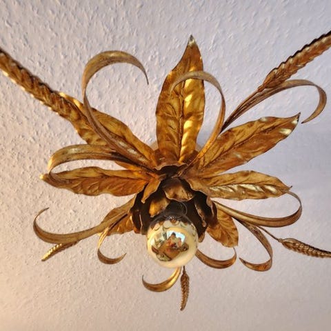 Denne smukke, store, sjældne vintage Florentine loft- og væglampe med blomster- og plantemotiver består af mange forgyldte blade og en central blomst, Banci, forgyldt i bladguld, designet i Italien med 6×E14-lyspunkter, arrangeret maskeret af de forgyldte og formede metalblade. Lampen imponerer med de naturlige former af blomster og blade. Designet og fremstillet af Banci Firenze i Italien, Firenze, i 1960'erne. Dette er den store model. En forgyldt metallampe i to niveauer med smukt blomsterdekoration. Den er lavet af metal med forgyldte egetræer. Hollywood Regency-stil mid-century lamper med blomsterdetaljer og antikt gull finish. Bærer præg af brug