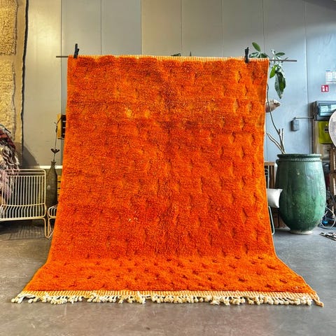 Oprindelse Marokko; model 'Tapis Berbère Tapis moderne en laine Moroccan Beni Ouarain Wool Rug – Handwoven Modern Geometric', 270 × 180 cm, 15 kg, orange uld håndvævet tæppe i meget god stand, professionelt renset, 21. århundrede. Klik på den blå "gå til varen" knap, for at købe eller byde på denne vare. Den samlede pris vil blive vist inden du afgiver dit bud.